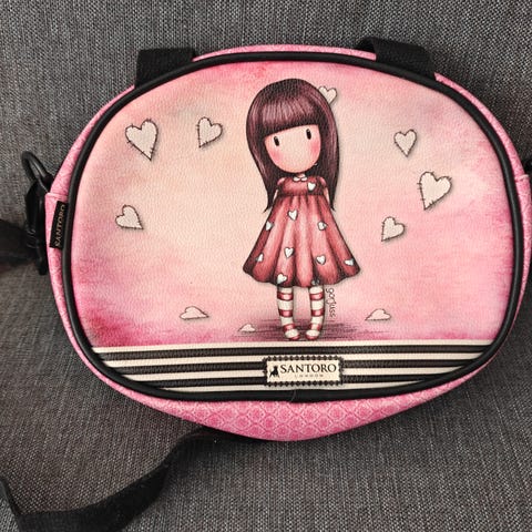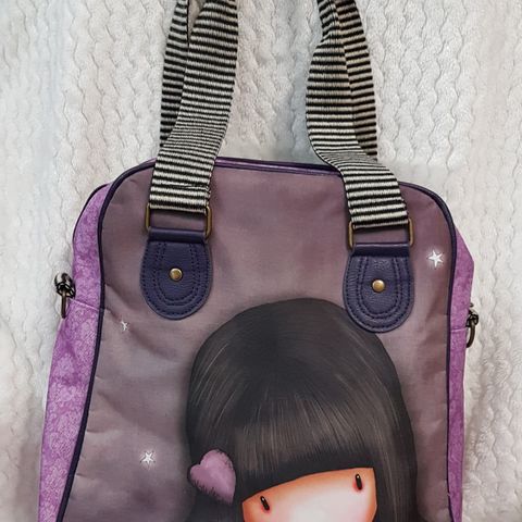 Kunnossa uudenveroinen Santoro Gorjus laukku jossa kaksi taskuja...Mukana pitkä hihna. Ainoa miinus että entinen omistaja päätti että tyttö kuvassa kaipaa hymyä... Pari kertaa kokeiltu mutta laukku ei ollut muuten käytössä. Malli: sugar plum