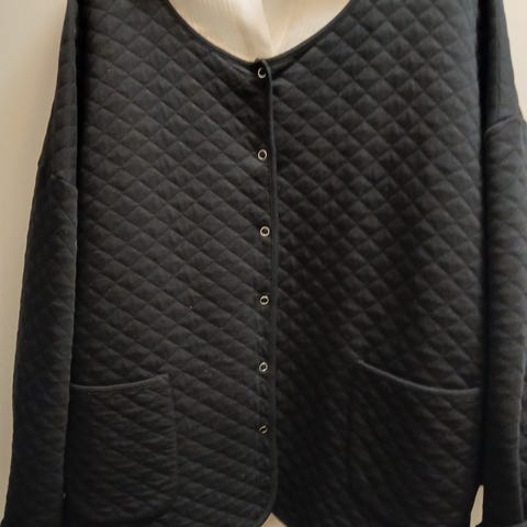 Nanso puuvillajakku koko L/XL (ks, mitat), 100% puuvillaa, neppari kiinnitys, taskut, elävä neulepinta nurjien- ja oikeiden silmukkaraitojen vaihtelulla.