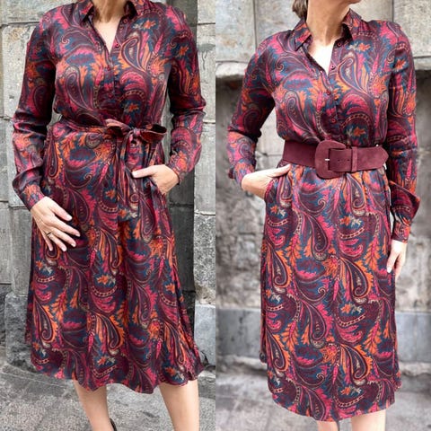 Part Two viskoosimekko. Alla joustava sininen alusmekko polyesteria. Napit vyötärölle asti. Ostettu käytettynä, joten en voi taata hajusteettomuutta. Kai-kai 51cm, olka-helma 96cm. Vastaa mielestäni kokoaan. Mallinsa puolesta toimisi myös imetysmekkona. En löytänyt mekosta mitään vikoja, kuntoluokitus voisi olla ”kuin uusi”.