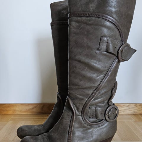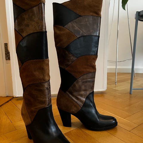 Myydään naisten saapikkaat nahkaa ja kangasta.