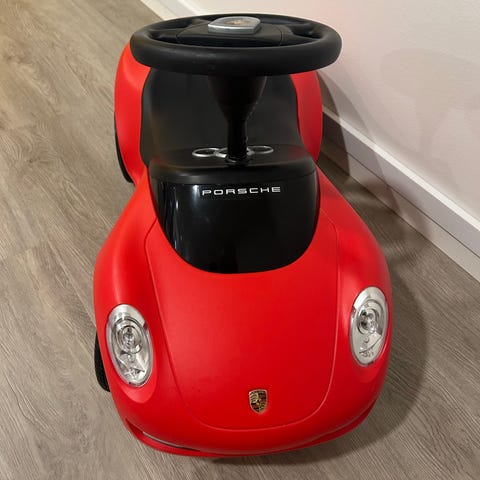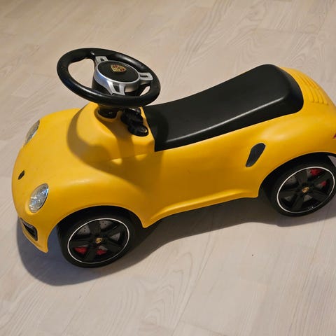 Myynnissä kuvan mukainen lasten Porsche. Valmistettu Saksassa. Ratti hölskyy vähän, mutta pyörät kääntyvät (ks. viimeinen kuva). Tuotekuvausta ja hinta uudesta samantyyppisestä saman valmistajan autosta Prismassa: