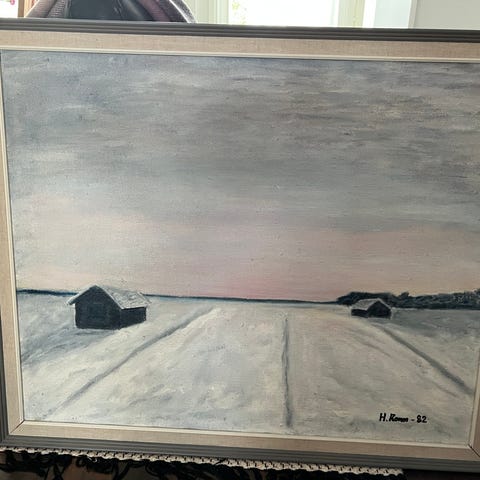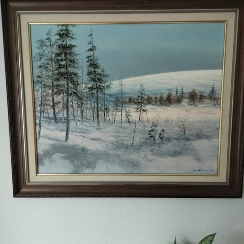 Eero Rissasen öljyvärimaalaus, jossa aiheena talvinen maisema. Nimi ”Hakkuut lehmilammella”.