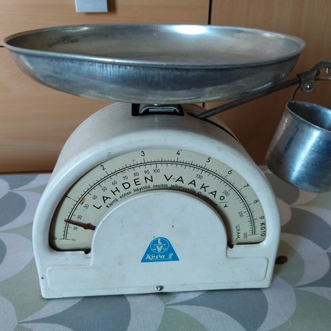 Myyntiin hienokuntoinen Lahden vaaka. Valitettavasti pikkukuppi hävinnyt, eikä yrityksistä huolimatta löytynyt, huomioitu hinnassa. Vaaka toimii, tarkkuudesta ei varmuutta.