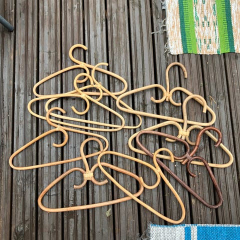 Myydään kolme rottinkista/puista (?) henkaria. Kunto kohtalainen ja tarvinnee uutta punosta kiinnityskohtaan (katso kuvat tarkasti).