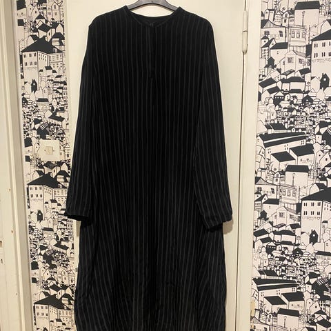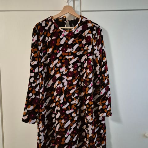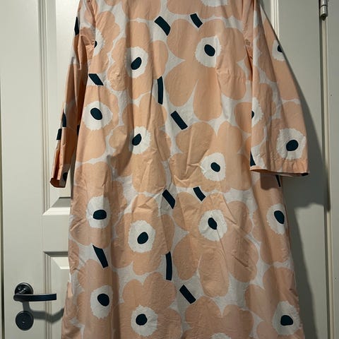 Uudenveroisessa kunnossa Marimekon vuorellinen mekko. Takana niskassa vetoketju sekä samaa kangasta nauhat, jotka voi solmia rusetille. Ei taskuja. Materiaali plyyshiä (75 % viskoosia, 25 % polyamidia).
