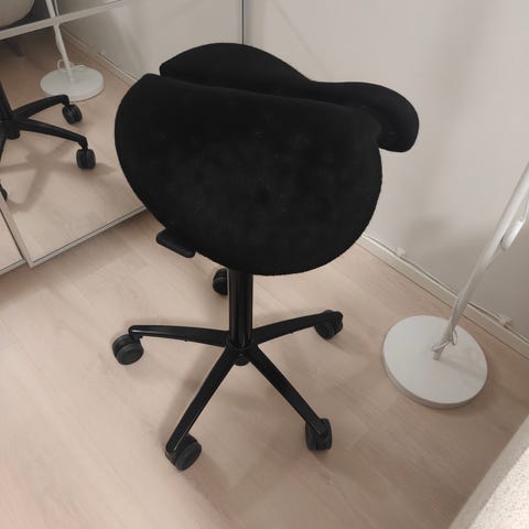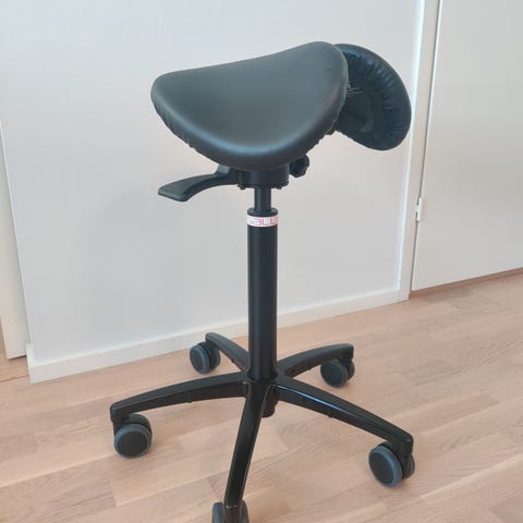 Korkeintaan muutamia kymmeniä tunteja käytetty satulatuoli. Istuinkorkeus säädettävissä välillä ~65cm ja ~90cm.