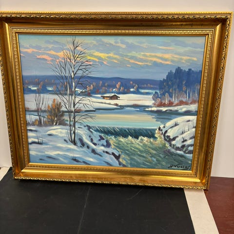 R. Vuolas maisemamaalaus kehyksissä.