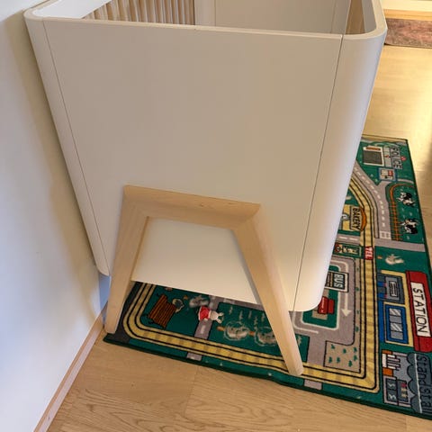 Vuonna 2021 ostettu valkoinen puusta valmistettu pinnasänky Vantaan Lastentarvike liikkeestä.