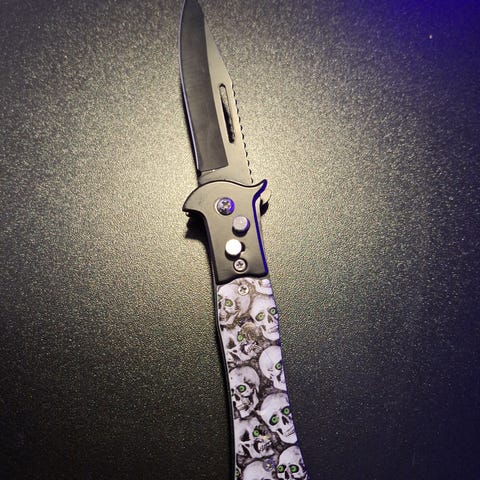 Harvinainen koristeellinen kääntöveitsi. Avautuu vivusta painamalla itsestään.
