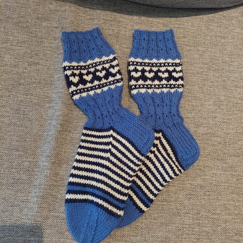 Uudet seitsemänveljestä langasta kudotut villasukat. Hinta 30€+pkt
