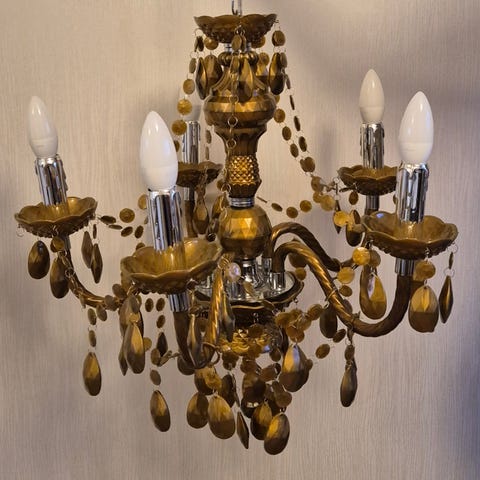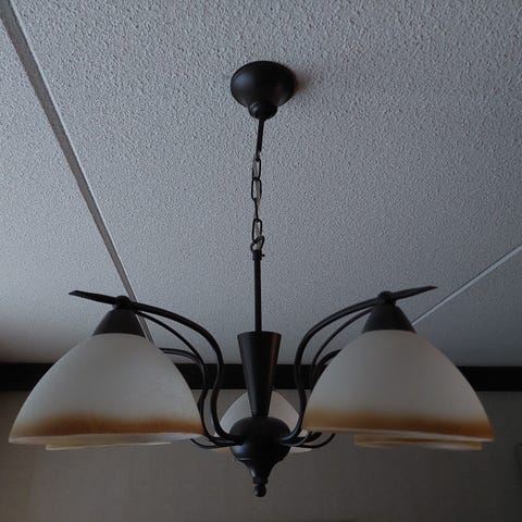 Myydään tarpeettomana Rovalo Design 5-lamppuinen kattovalaisin, jossa on valkoiset savulasiset, röpeliäiset varjostimet ja vihertävän kultainen metallirunko.