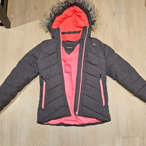 Huppu, lumisuojat vyötäröllä ja hihansuissa, vetskarit pelaa, , kainalo-kaialo 50 cm , hiha 56 cm , kokopituus 62 cm, valkoisissa osissa jonkin verran tummentumaa