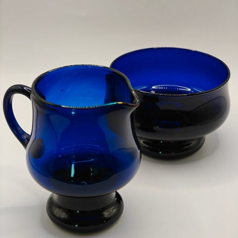 Aimo Okkolin Riihimäen Lasille suunnittelemat Ruutu kermakko ja sokerikko hopeajalalla.