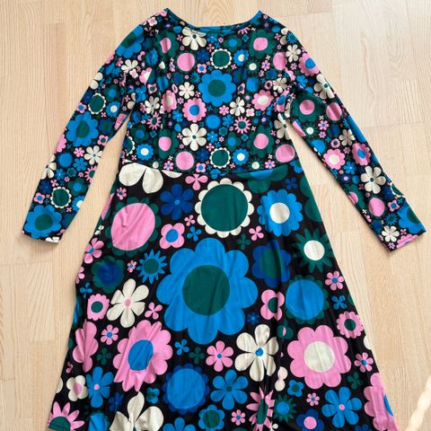Kaunis, midi-mittainen, pitkähihainen, kevyt mekko. Koko XL, täältä ostettu ja hieman pieni käsistä minulle niin laitan samantien eteenpäin. Kainalo-kainalo 60cm. Vyötäröllä kiristysnyöri, helmassa röyhelö. Hihansuissa napit. Miehustan napit aukeavat vyötärölle saakka, valenapitus vyötäröltä helmaan.