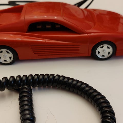 Design -esine punainen Ferrari Testarossa lankapuhelin. Täysin toimiva ja ollut käytössä aikoinaan vain hetken. Nokalla komea Ferrarin logo. Hyvä näppäinpuhelin.