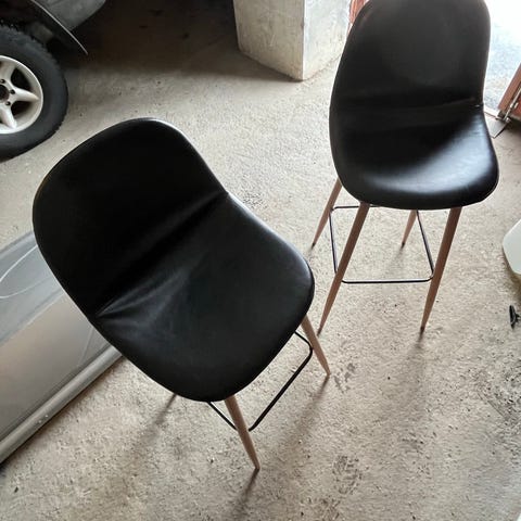 Myydään 3 kpl mustia, nahkaisia baarituoleja. Myydään koska ei ole itsellä enää käyttöä. Ostettu vuonna 2019. Kunto hyvä, paitsi että istuimien päälliset hieman revenneet (katso kuvat). Tämä ei kuitenkaan haittaa käyttöä. Myydään kaikki kolme yhteensä 40€ tai 15€/kpl (ovh ollut 60-70€/kpl). Vain nouto.