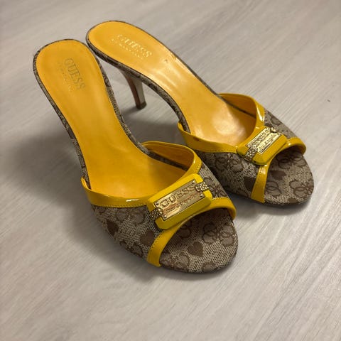 Guess upeat kullanväriset juhlakengät. Koko pohjassa 7M ja kirjoitettu 36, mutta kyllä nämä ovat ennemminkin kokoa 37. Itselleni hiukan liian suuret. Plato pohja 2,5cm ja korko 12cm. Muutaman kerran käytetty ja hyvässä kunnossa.