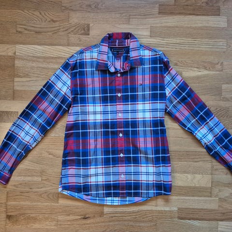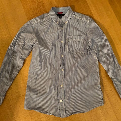 Sini-valkoraidallinen Tommy Hilfiger kauluspaita. Materiaalilappu leikattu, mutta on 100% puuvillaa. Hihat saa myös lyhennettyä. Koko lasten 16 eli vastaa XS-S. Kai-kai n. 45 cm.