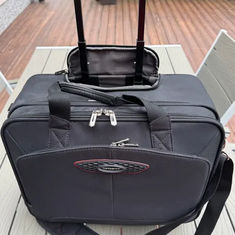 Tässä tarjolla Samsonite-merkkinen tietokonelaukku. Laukku on 45 cm leveä, 34 cm korkea ja pohjan kokonaisleveys 17 cm. Laukussa on noin 6 cm levyinen vahvike, joka pitää laukun kuosissaan. Laukun etupuoli on kova ja hieman pullea. Takana on vetoketjullinen laukun levyinen lokero. Irrotettavan kantohihnan koko pituus on 140 cm ja siinä on olkapäälle tarkoitettu levennys.