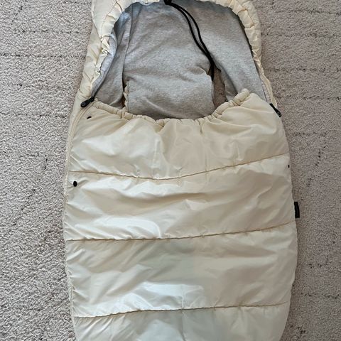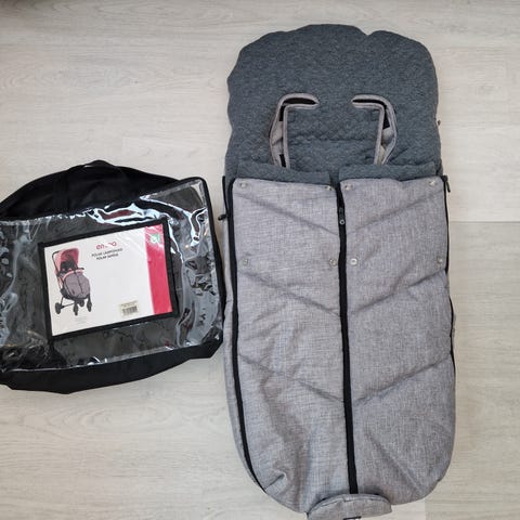 Hyväkuntoinen välikauteen sopiva Emma-merkin vuorellinen lämpöpussi rattaisiin. Ainoa pieni moite näkyy kuvassa: rattaiden turvavöiden laittokohdassa pientä kulumaa, joka ei edes näy pussin ollessa kiinni rattaissa.
