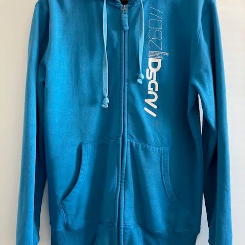 Materiaali 75 % puuvillaa ja 25 % polyesteriä. Hupparin edessä vetoketjukiinnitys ja edessä kaksi taksua. Hupussa on musta trikoinen vuori. Huppari pesty myyntiä varten.