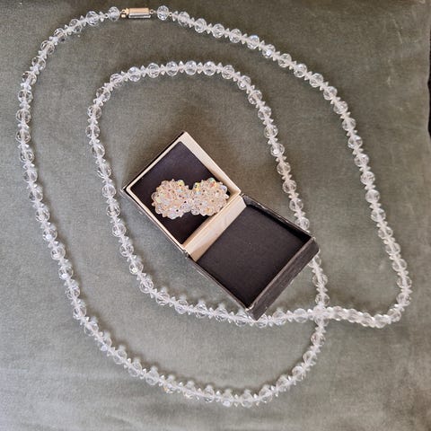 Uutta vastaavassa kunnossa olevat vintage korut/korusetti. Peräisin 1960-1970 luvuilta. Ihana kimmellys, josta tulee väriä kuvaan. Kuitenkin väri on kristalli, ei ole värjätty.