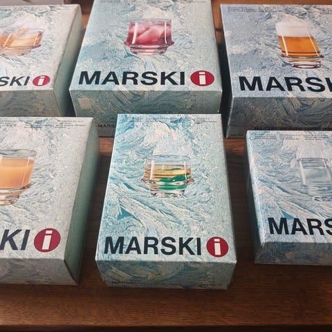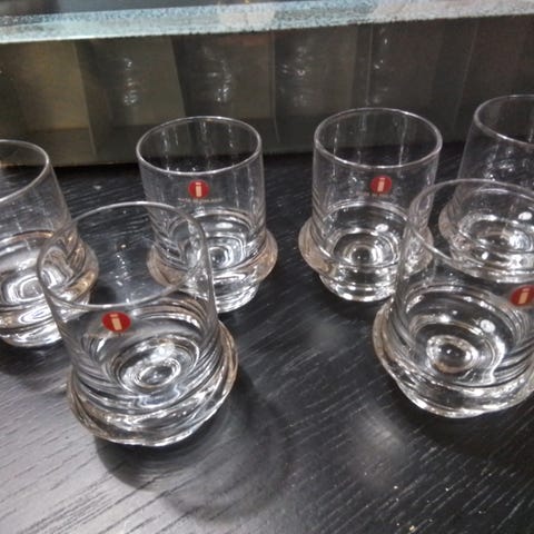 Tapio Wirkkalan Iittalalle suunnittelemat Marski sarjan käyttämättömät drinkkilasit 5 kpl, 70-luvulta.