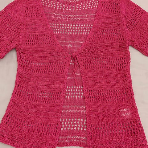 Musta virkattu neulejakku. Kiinnitetään edestä kahdella hakasella. Napit koristeena. Käyttämätön, mutta laput leikattu pois, kun näkyivät päällepäin. Kainalomitta noin 55 cm. Ostettu Haloselta.