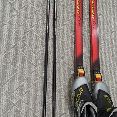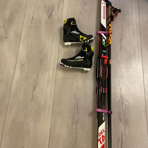 Monot Salomon 35.5 NNN/Prolink. Sukset Fischer RCR 152cm. Sauvat Rex 120cm. Muuten siisti setti mutta toisen suksen kanta vaatii tipan sikafleksiä kun pinta repsottaa.