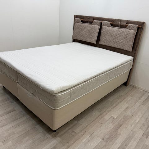 Hilja vuodekokonaisuus sisältää päädyn, helmalakanan ja tyyny päälliset vihreällä kankaalla, Runkojen jäykkyydet medium ja Firm. Myymälän esittely vuode. Päädyn syvyys noin 4 cm
