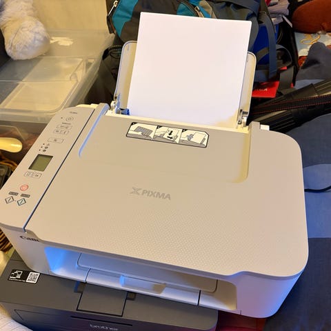 Canon Pixma TS5351 väritulostin/skanneri. Kaipaa värikasettien vaihtoa.
