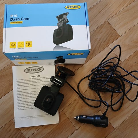 Ring R10 kojelautakamera. Minulla ei ole autoa enää niin en tarvitse tätä. Toimii mainiosti ja mukana 32Gb sd-kortti. Kiinnittyy etulasiin imukupilla. Mukana laatikko ja manuaali.