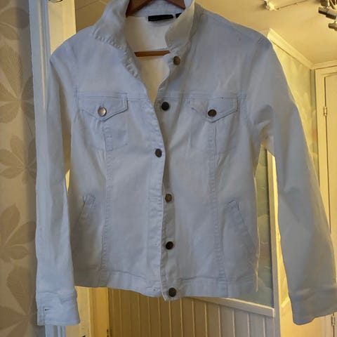 Valkoinen farkkutakki, koko M. Kai-kai 2x 46 cm, pituus takaa kauluksen alta 55 cm. 4 taskua. Erinomainen kunto, ei tahroja. Puuvillaa/elastaania, joustava kangas