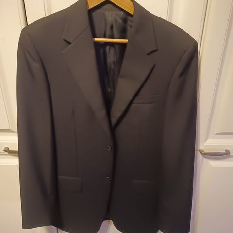 Dressmann Batistini musta puku, koko XXXL. Puku sisältää takin ja housut, valkoisen pitkähihaisen kauluspaidan ja beigen kravatin.