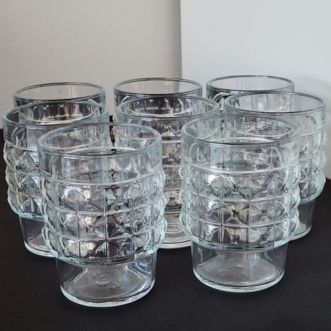 Vintageajan, hyväkuntoiset Riihimäen Lasin Lappi-sarjan juomalasit, jotka muotoilunsa vuoksi ovat myös kätevästi pinottavissa päällekkäin.