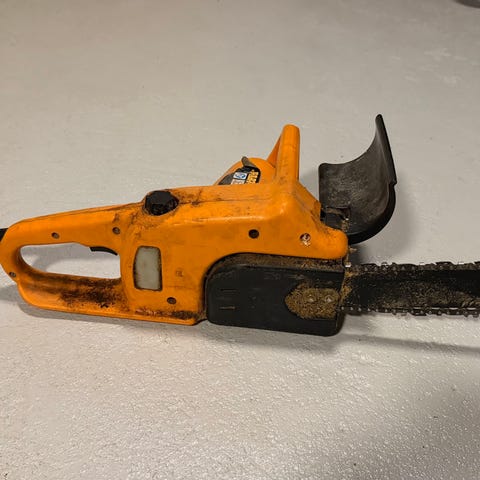 Fxa sähköketjusaha 230V, harmaa väri, varustettu teräsahalla ja suojakotelolla. Sopii puiden ja oksien sahaamiseen kotitalouskäytössä.
