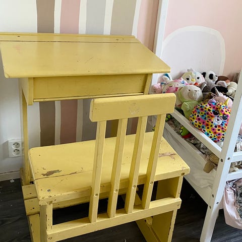 Annetaan vanha yhden istuttava pulpetti. Pulpetin korkeus 75 cm, leveys 60 cm ja syvyys 43 cm. Toinen sarana vähän "lenkkaa". Kansi puun värinen ja alaosa vihreä, päällä lakka. Ostettu projektiksi joka jäi sitten tekemättä 🙈