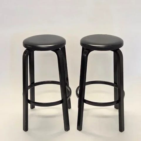Artek Alvar Aalto baarijakkara, musta väri. Jakkara on valmistettu kestävästä materiaalista ja siinä on tukeva rakenne. Sopii käytettäväksi baaritiloissa tai keittiössä korkeiden pöytien kanssa. Tuoleja on 2 kpl hinta/kpl tai 2 kpl 450€ istuinosassa pieni vekki, ja rungossa muutama kolhu