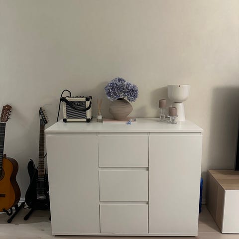Massiivipuinen senkki, yhteenkuuluva peili mukaan. Senkki on maalattu.