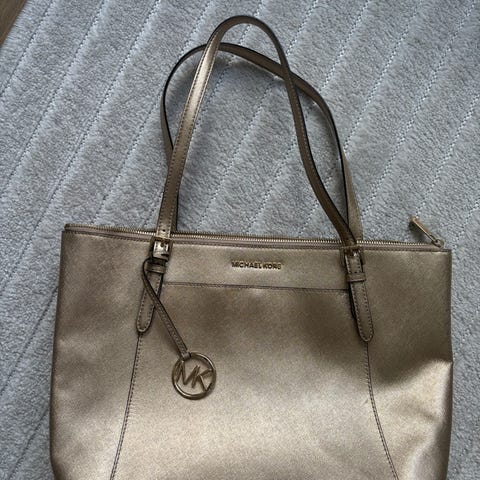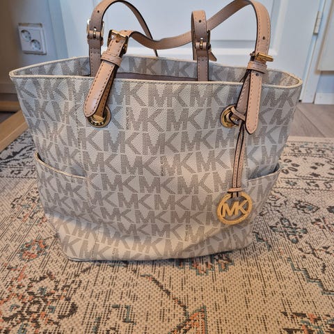 Mk:n Eva large logo stripe tote laukku. Kivan kokoinen ja mahtuu tavaraa. Sisällä muutama isompi tahra joka huomioitu hinnassa. Mukana samaan sarjaan kuuluva clutch jonka saa myös irti laukusta.