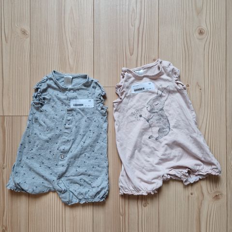 Valkoinen koko 59 eli noin 3kk ikäiselle, harmaa nallepuh koko 62. Nappi kiinnitys takapuolella. Ehjiä ja siistejä kumpikin.