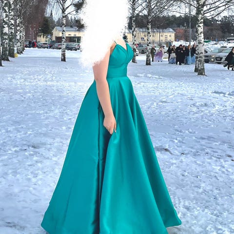 Kaunis, vihreä vanhojentanssimekko. Koko XS. Vain kerran käytetty. Yläosa pitsiä, alaosa satiinia ja tylliä. Selässä narut, joilla mekon voi kiristää juuri sopivaksi. Mekkoa voi tulla sovittamaan. Vain nouto.