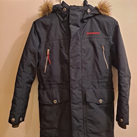 Sininen Didriksons-talviparka, koko 160 – sopii 5.–6.-luokkalaiselle.