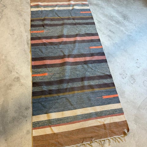 Myynnissä harmaa puuvillamatto. Ollut pitkään käyttämättömänä koska ei löytänytkään paikkaana. Materiaali puuvilla. Mitat ilmoitettu ilman hapsuja. Sijaitsee Hietalahdenkadulla Kampissa.