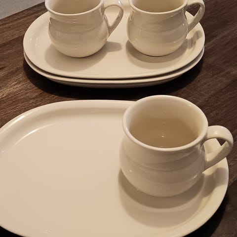Oliivinvihreä astiasto sopii esimerkiksi aamiaisen tarjoiluun. Lautasissa muotoiltu paikka kupille.