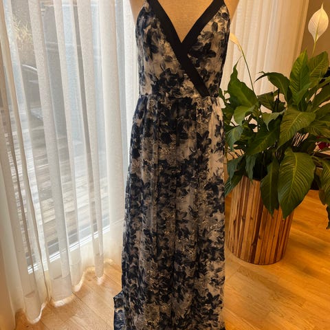 Karen Millen ilta- tai juhlapuku, väriltään keltainen mustilla pitsiyksityiskohdilla. Koko 38. Hyvä kunto, kaksissa juhlissa pidetty.