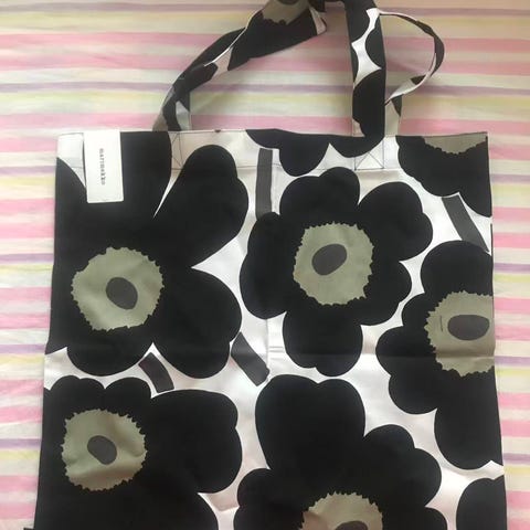 Itse tehty unikko kangaskassi, jossa pohjassa kovike ja tarrakiinnitys.