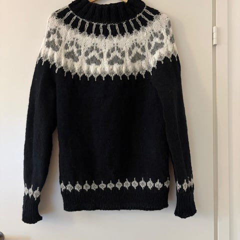 Villapaita, itse kutomani, koko M-L (miksipä ei S-kokoisellekin). Toispuoleinen kaulus. 65€