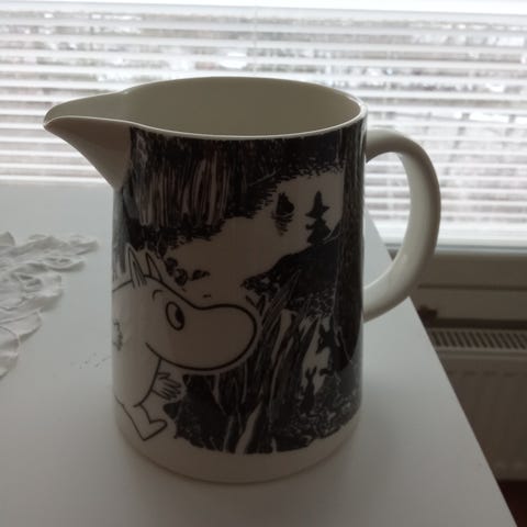 Itsellä myynnissä vain tämä kaadin, mutta astiastoon kuuluu kaatimen lisäksi kohokuvioitu juomalasi, kulho ja lautanen, joita on saatavilla Moomin Arabialta ja Iittalalta.