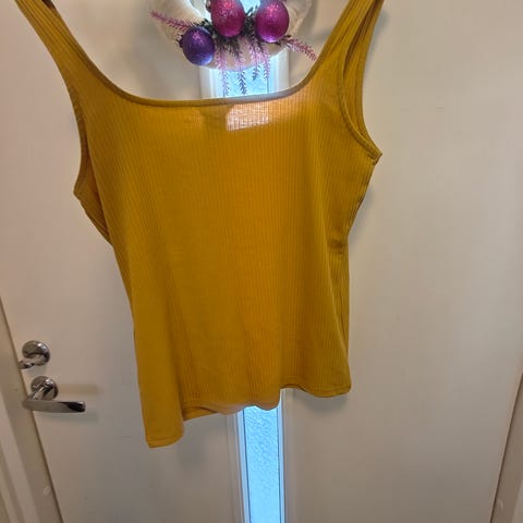 Myydään Lindexin keltainen T-paita, jossa kaunis rypytys helmassa.